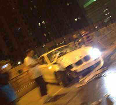 寶馬凌晨撞清涼門大橋上的南京護欄網,寶馬車頭嚴重變形